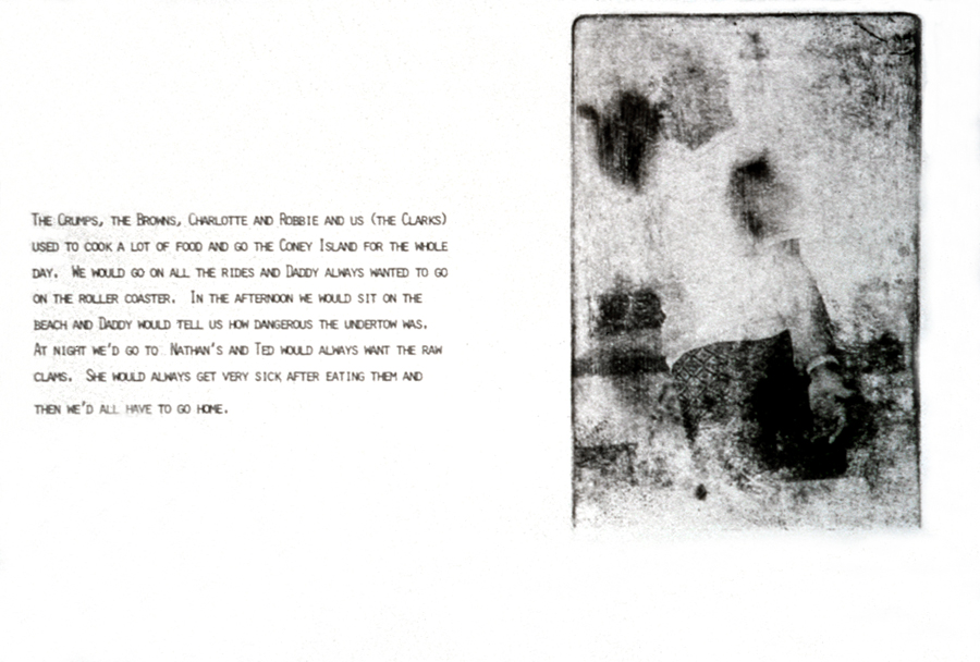 "The Crumps, the Browns, Charlotte and Robbie and us (the Clarks) used to cook a lot of food and go to Coney Island for the whole day. We would go on all the rides and Daddy always wanted to go on the roller coaster. In the afternoon we would sit on the beach and Daddy would tell us how dangerous the undertow was. At night we'd go to Nathan's and Ted would always want the raw clams. She would always get very sick after eating them and then we'd all have to go home."